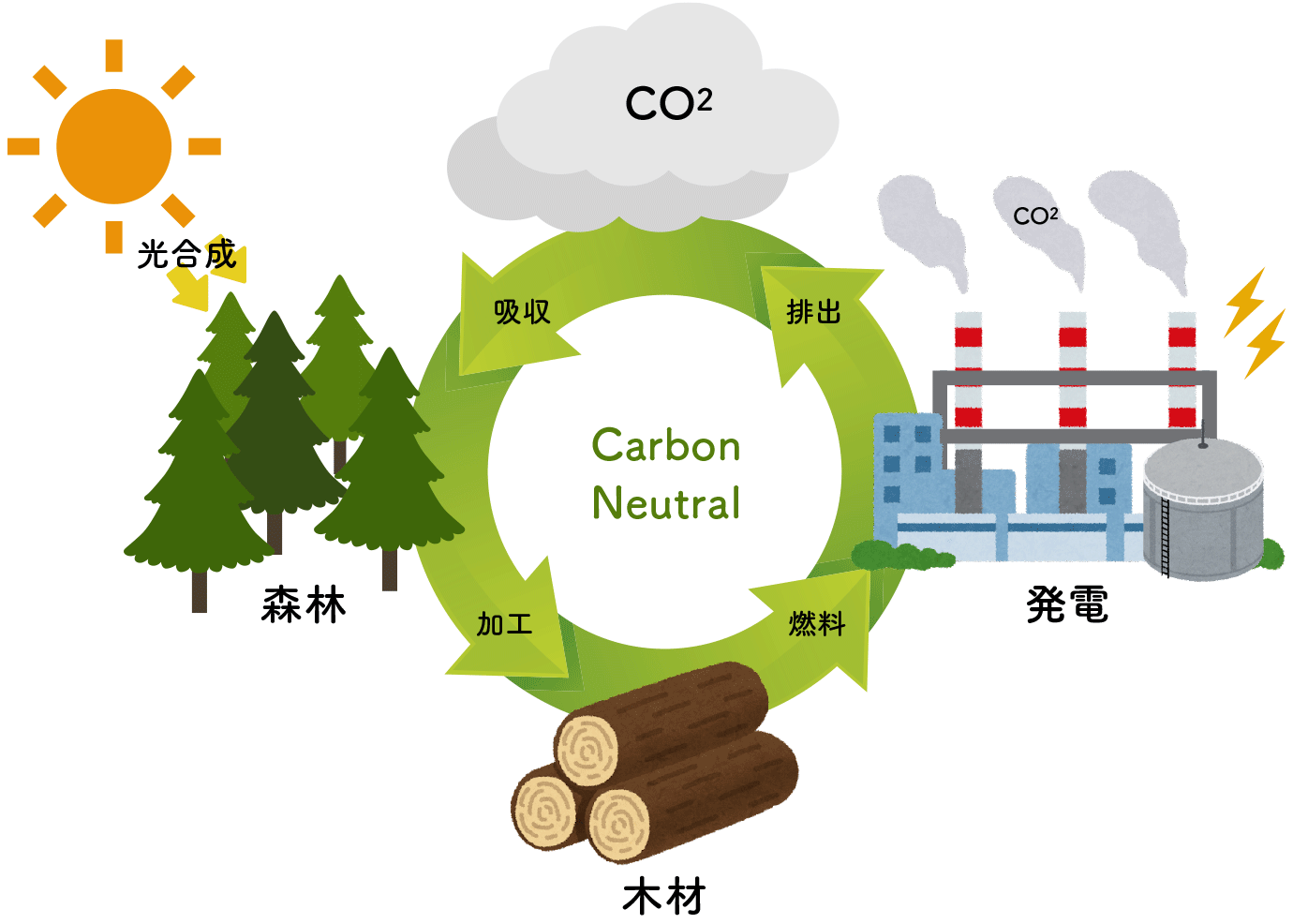 木質系バイオマス発電施設は、ライフサイクルにおいて実際に大気中の二酸化炭素の増加に影響を与えないカーボンニュートラルの考え方からも、新たなエネルギーとして注目されています。