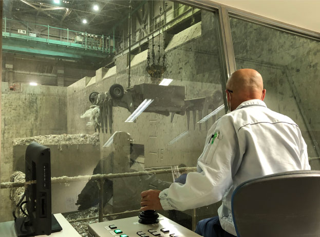 その他、パッカー車にて運ばれてきた一般廃棄物を、クレーン操作で焼却炉へ投下し、有害物質の発生がより少なくなる規程温度以上の燃焼を維持しています。