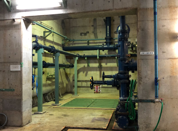 浄水施設では、河川より取水した原水をろ過し消毒した後に、皆さまのご家庭へ各所のポンプ場を経由して安全な水道水としてお届けします。
